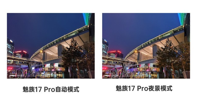 还有一个让人印象深刻的点在于夜景的表现,在应对复杂光线时,魅族17 Pro的多帧合成能够较好地完成高光压制与暗部提亮。经由两组对比样张,能够明显感受到魅族17 Pro在夜景上的整体表现。