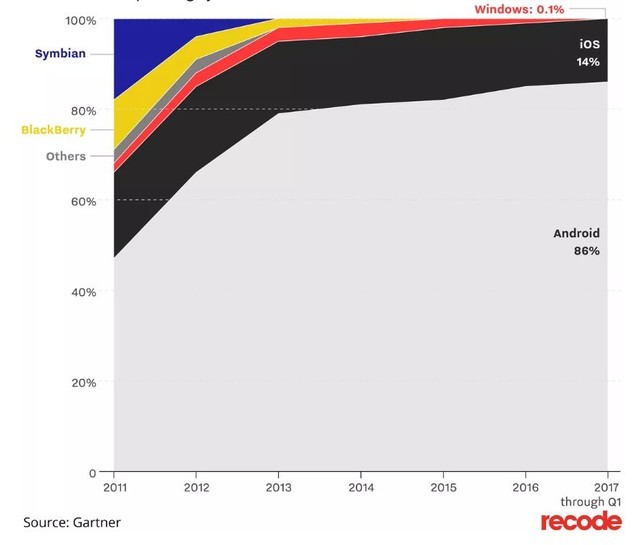 Palm、黑莓和Windows Mobile并不是仅有的祭品,当苹果和安卓智能手机降临的时候,移动操作系统无一幸免。